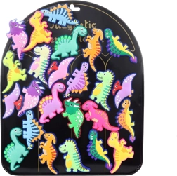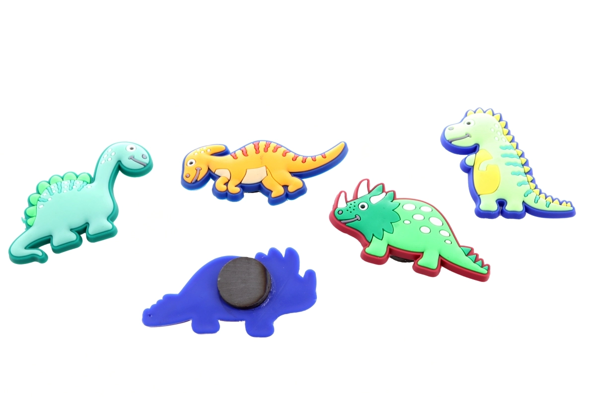 Glade magneter med dinosaurmotiver vil glæde både børn og voksne. Hver magnet er cirka 5 × 5 cm, lavet af blød plast og er beregnet til dekorative formål.