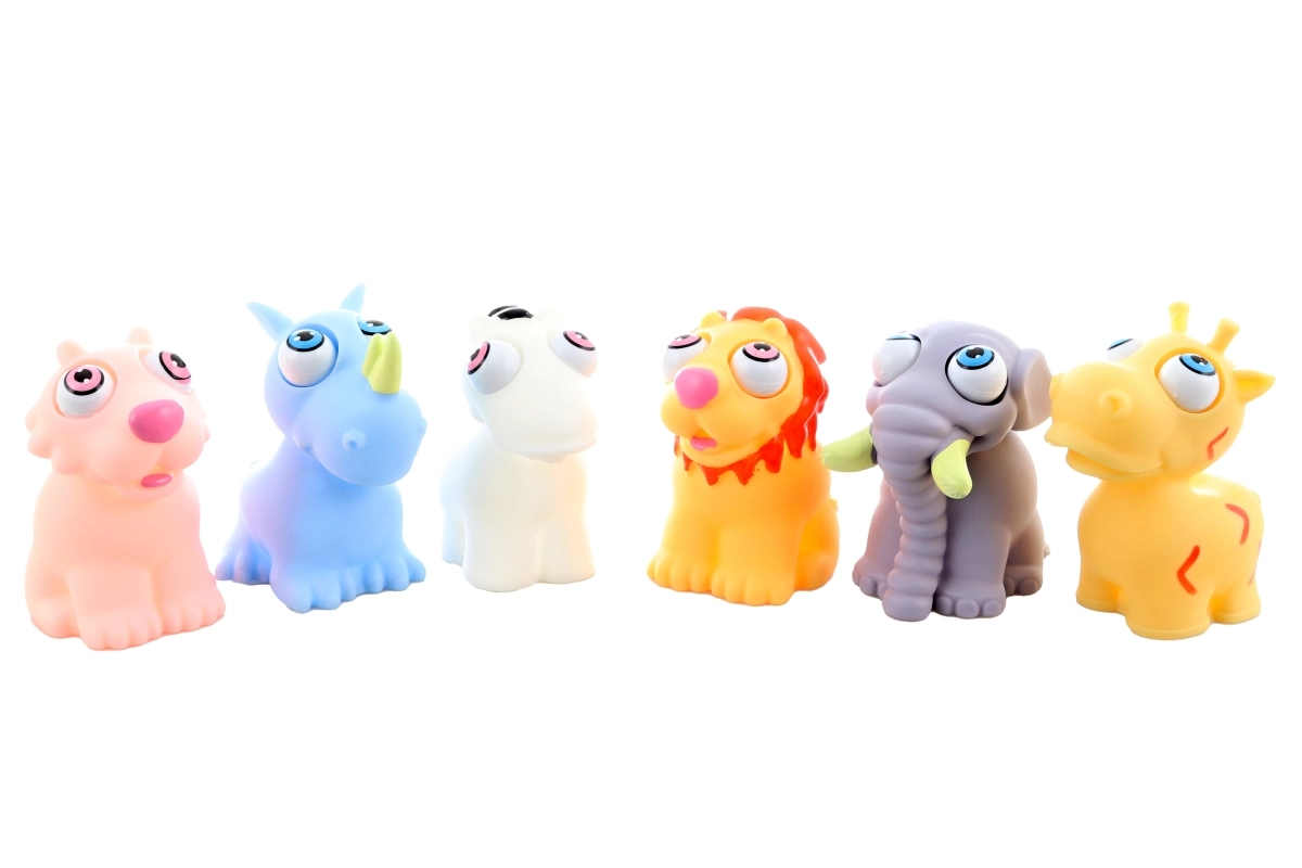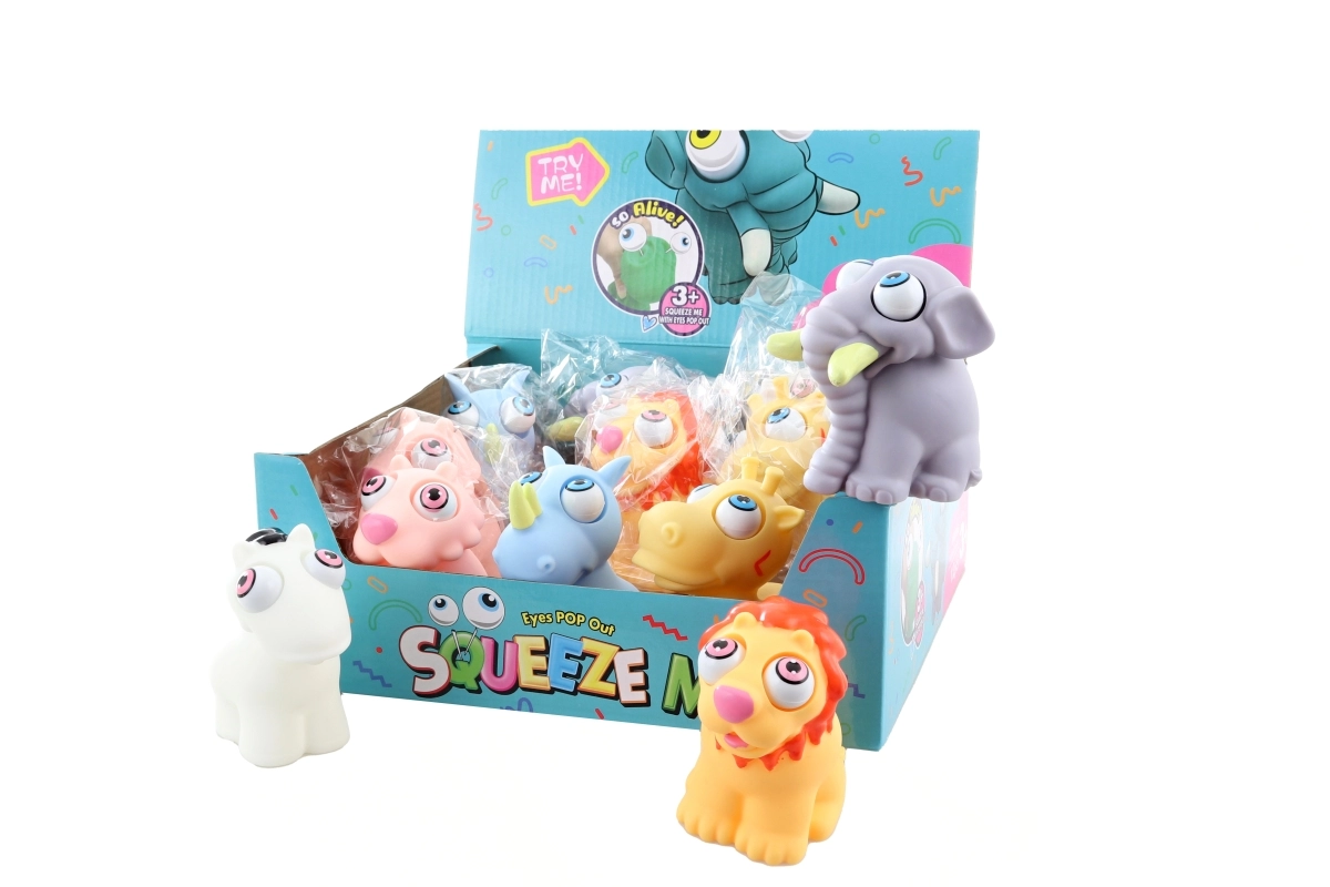 Opdag de sjove klemmedyr med store øjne, som ved tryk får øjnene til at springe komisk ud. Takket være den bløde plast er de behagelige at klemme og er perfekte til træning af finmotorik samt som antistress-legetøj for børn fra 3 år.