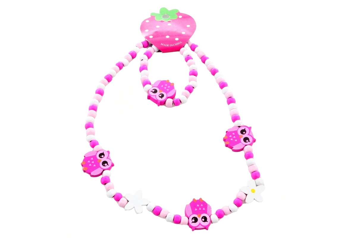 Dette stilfulde sæt med uglemotiver er ideelt til at fuldende et børneoutfit til fester, i børnehaven og til hverdagsbrug. Takket være den elastiske snor tages smykkerne nemt på og tilpasser sig håndled og hals uden ubehageligt pres.