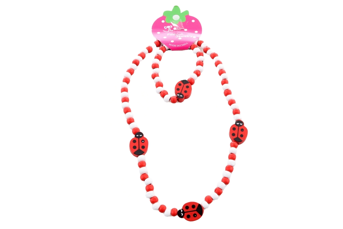 Yndigt sæt til små pyntedukker med motiv af mariehøns. Indeholder en halskæde og et armbånd af træperler på en elastisk snor, som gør dem behagelige og fleksible. Ideelt til hverdagsbrug og som en sødt gave.