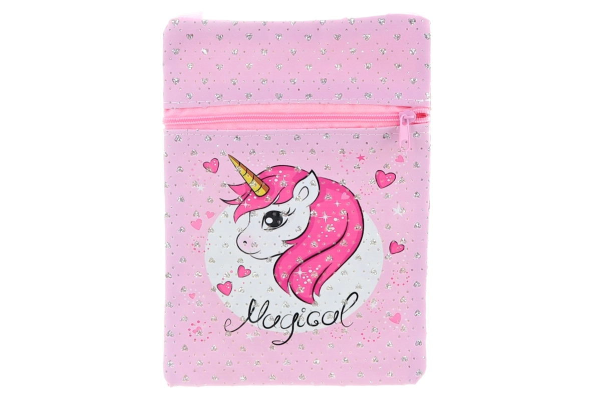 Denne elegante skuldertaske med et magisk enhjørningemotiv er perfekt til hverdagsbrug. Takket være de kompakte mål passer mobil, nøgler og pung nemt, mens lynlåsen sikrer sikker opbevaring af alle småting.