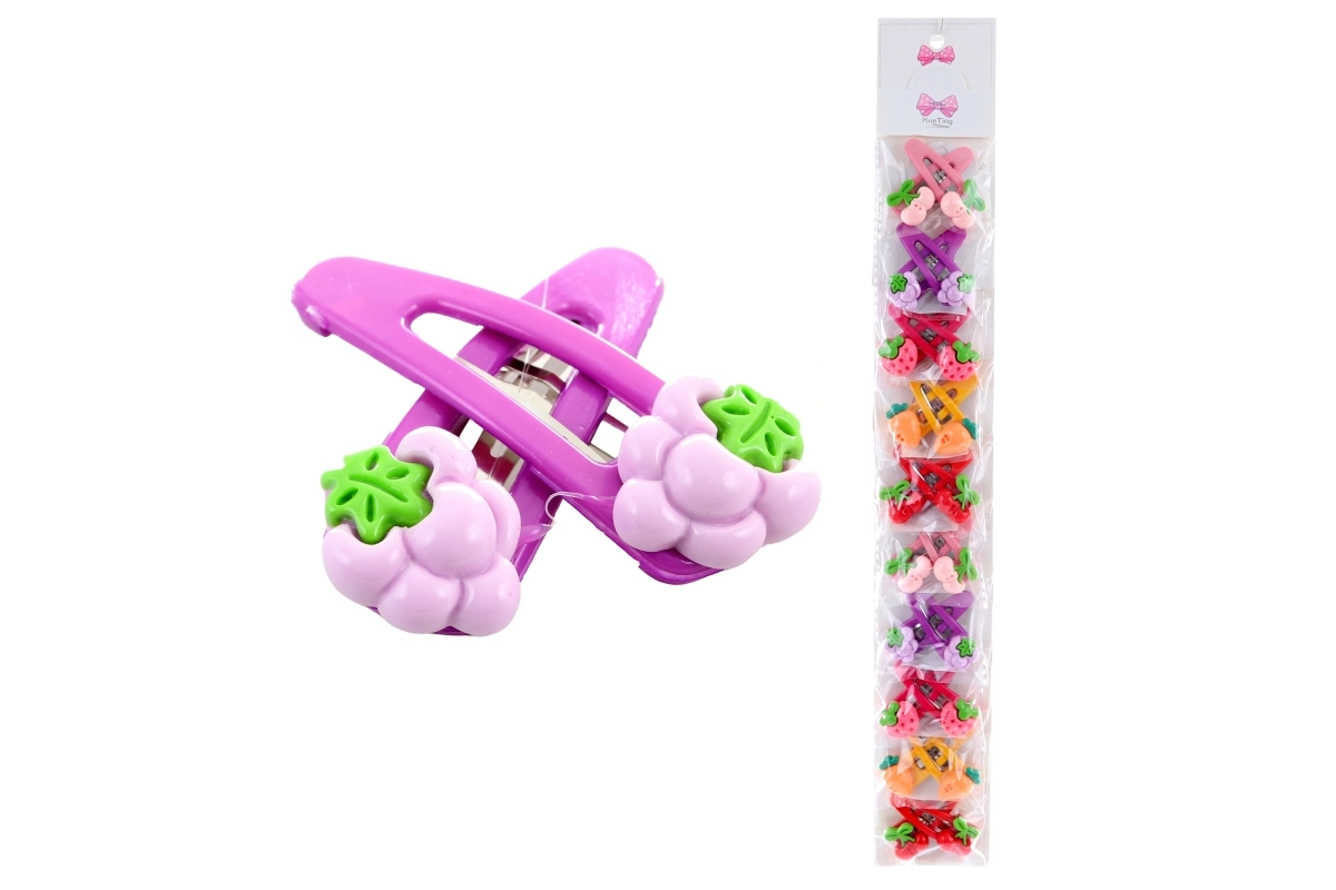 Pift din frisure op med legende hårspænder med frugtmotiver. De er lette, nemme at sætte i og holder godt, så de passer til både børn og voksne. Hvert sæt indeholder 2 spænder i forskellige farvekombinationer, pakket i en pose.