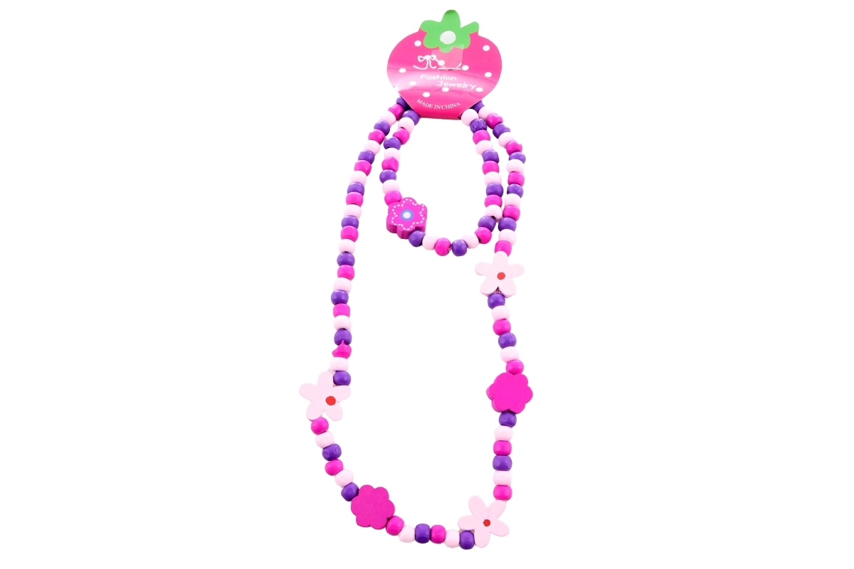 Dette fine sæt indeholder en halskæde og et armbånd lavet af kvalitets-træperler i klare farver med blomstermotiv. Den elastiske snor sikrer nem påtagning og komfortabel brug uden lukning. Perfekt til at fuldende børns outfits og give ekstra glæde ved at klæde sig på.