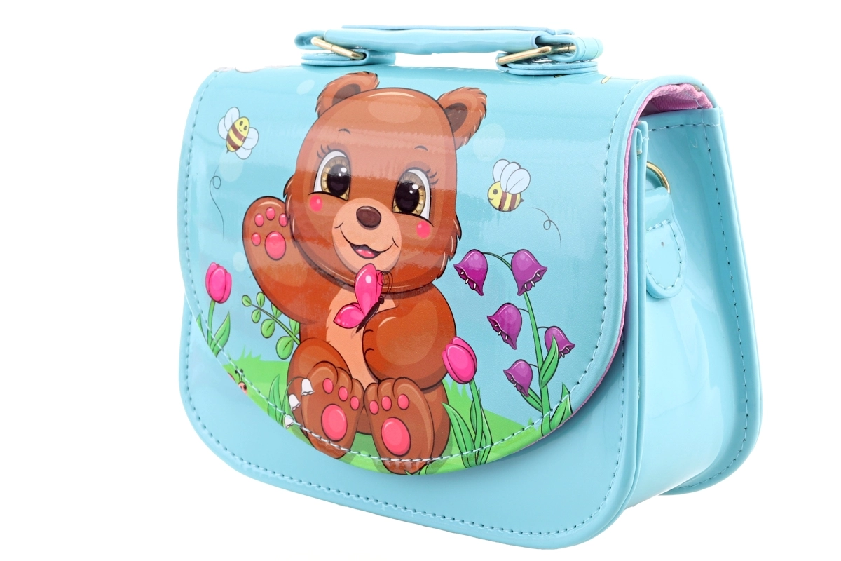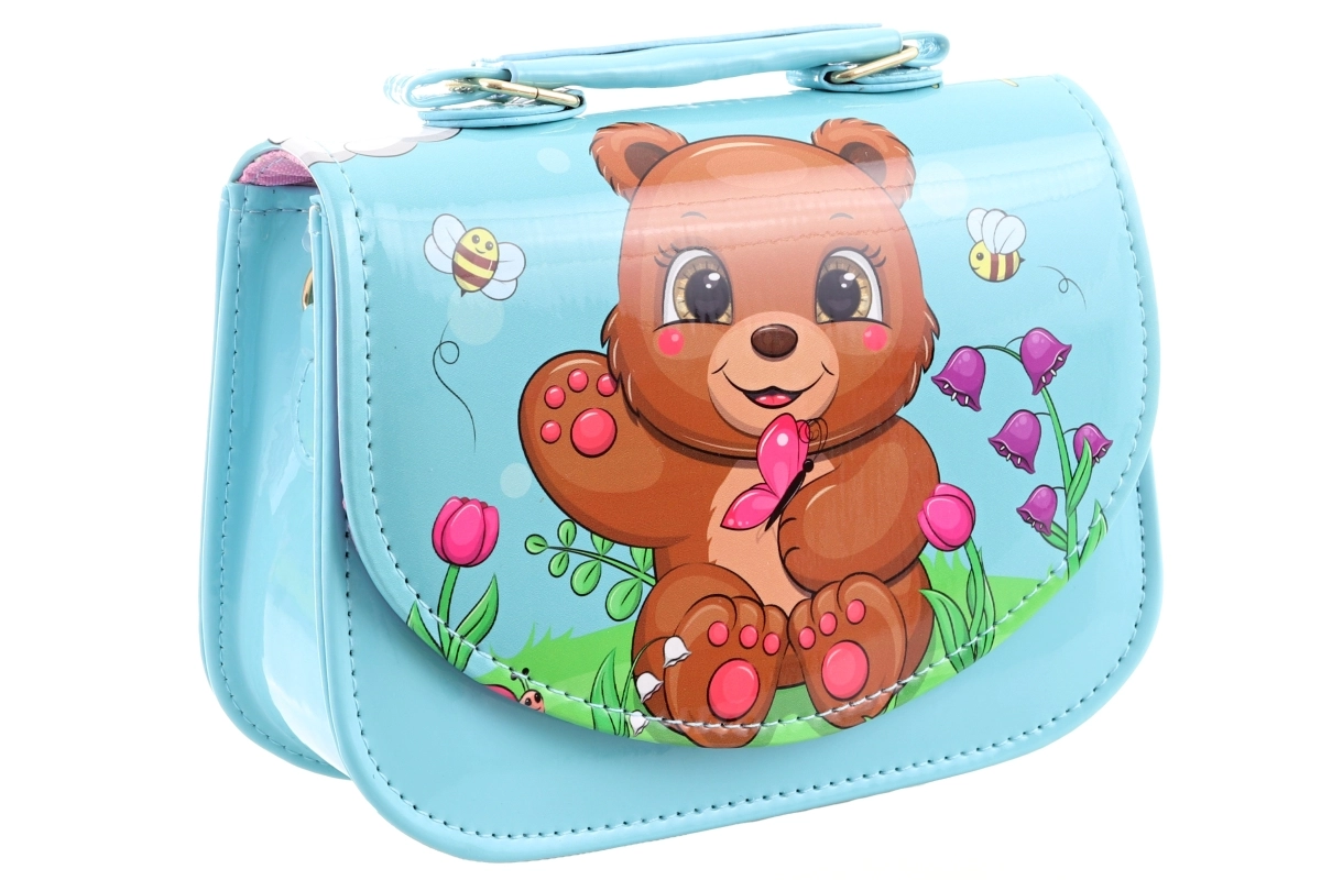 Denne børnetaske med en sød bjørn og blomstrede motiver bliver en favoritaccessory til gåture, besøg og fester. Takket være den blanke, glatte overflade er den nem at holde ren og ser altid ny ud. Trykknaplukningen sikrer hurtig og sikker lukning.