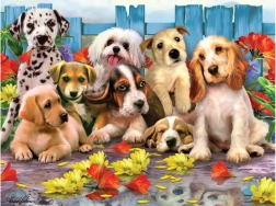 Farverig illustration fuld af hvalpe og blomster glæder både børn og voksne og indbyder til at lægge puslespillet igen og igen.