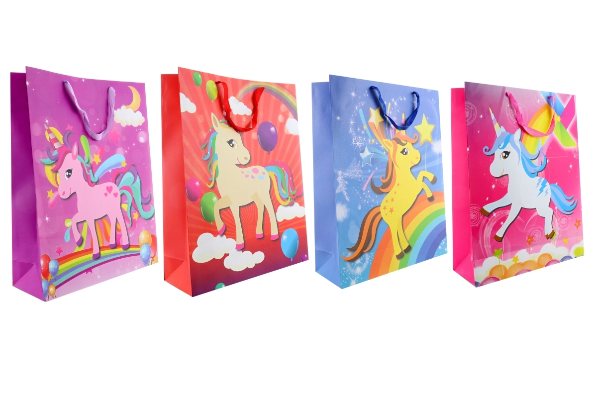 Leder du efter en iøjnefaldende indpakning til en særlig gave? Denne store gavepose med et magisk enhjørningetema imponerer ved første øjekast. Det robuste papirmateriale og det praktiske format gør det nemt at pakke selv mere voluminøse genstande.