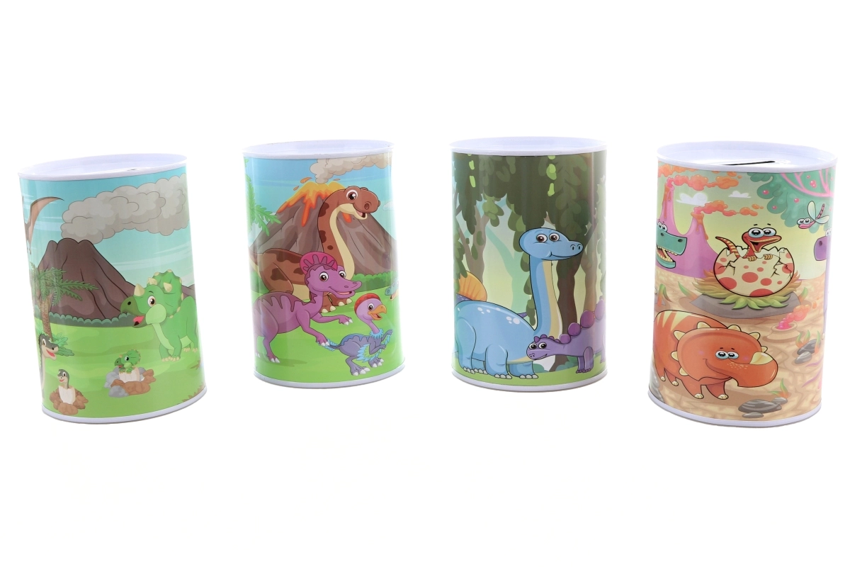 Denne metalsparbøsse med et muntert dinosaurusmotiv er et ideelt tilbehør til børneværelset. Den lærer børn på en sjov måde at håndtere penge og fungerer samtidig som en stilfuld dekoration. Takket være den solide metalkonstruktion er den modstandsdygtig over for daglig brug.