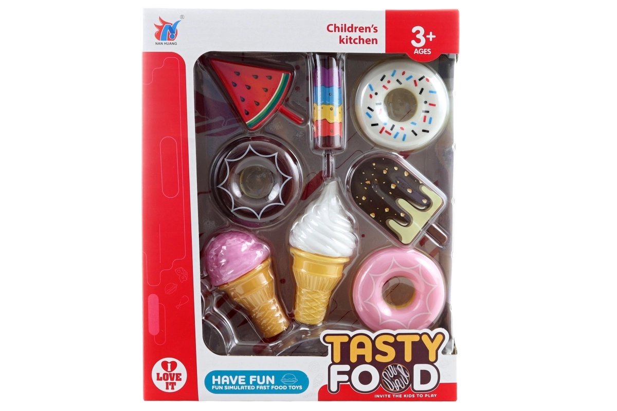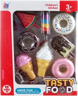 Dette slik-/dessertsæt er ideelt til legekøkkener, legerum og butikslæg. Takket være let og robust plast kan børn trygt udvikle fantasi, finmotorik og sociale færdigheder gennem fælles leg.