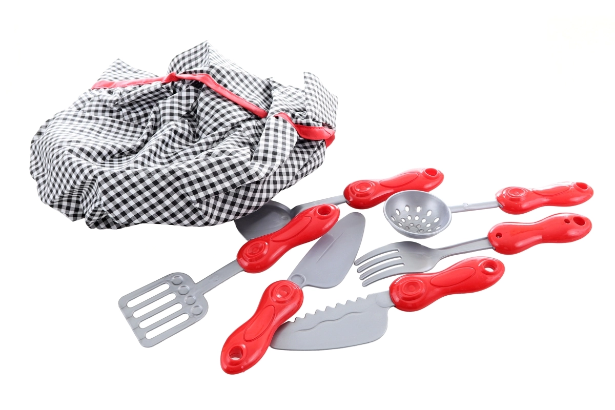 Plastiske køkkentilbehør med ergonomiske greb er designet til små hænder og sikker leg.
