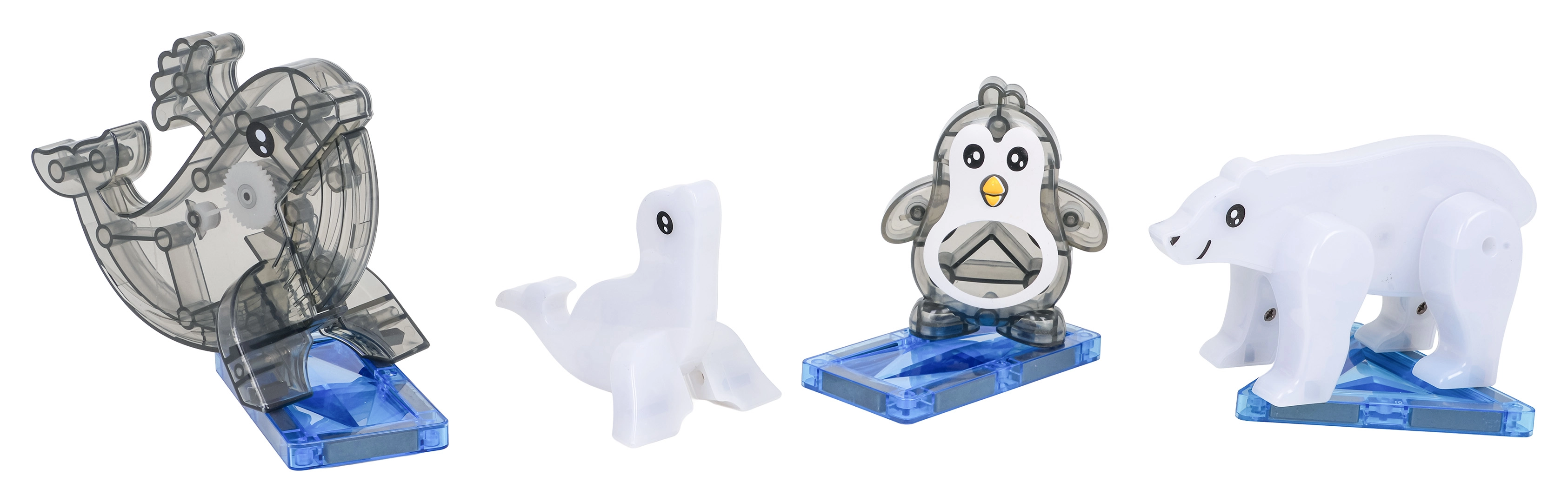 Figurerne har bevægelige elementer (delfinen åbner munden, bjørnen bevæger benene, pingvinen løfter og sænker finnerne), hvilket understøtter fantasifulde fortællinger og finmotorik. Delene kan kombineres i forskellige vinkler og skabe uendelige variationer – fra simple former til komplekse 3D-modeller.
