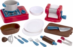 Takket være det omfattende udstyr – gryder, redskaber, pasta-presser, skærebræt, kagerulle, ingredienser som “æg”, “salat”, “tomat” og “mel til pasta” – kan børn nemt efterligne tilberedningen af yndlingsretter. Sættet er ideelt til rollen som kok, servitrice/servitør og gæst og giver timevis af kreativ underholdning.