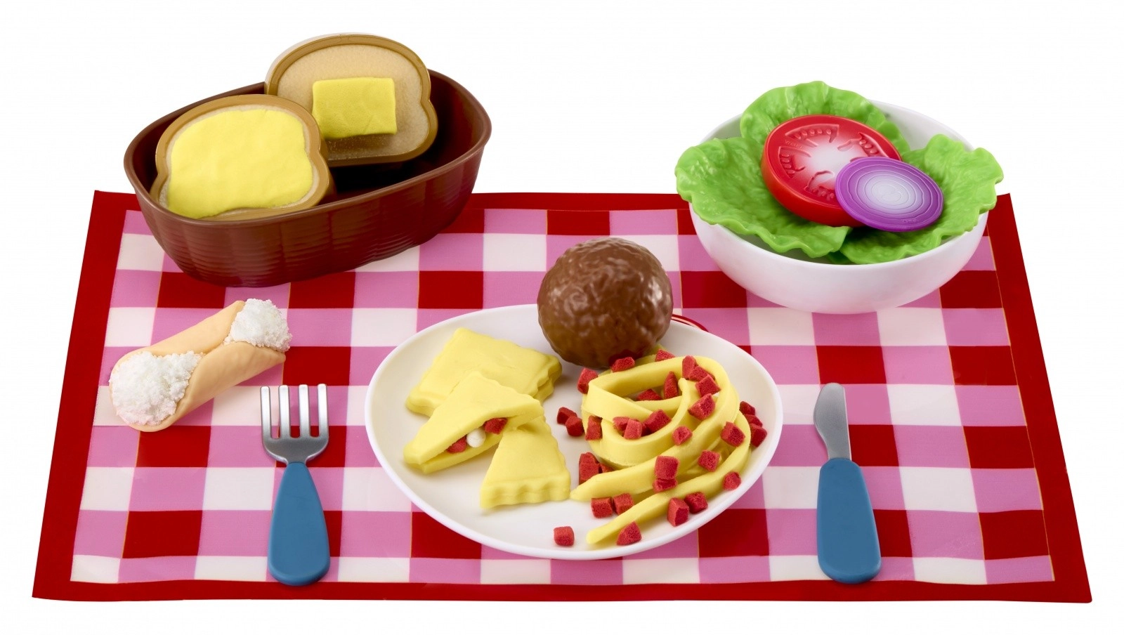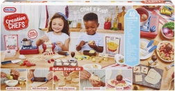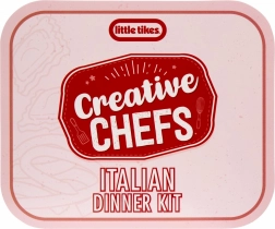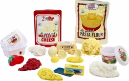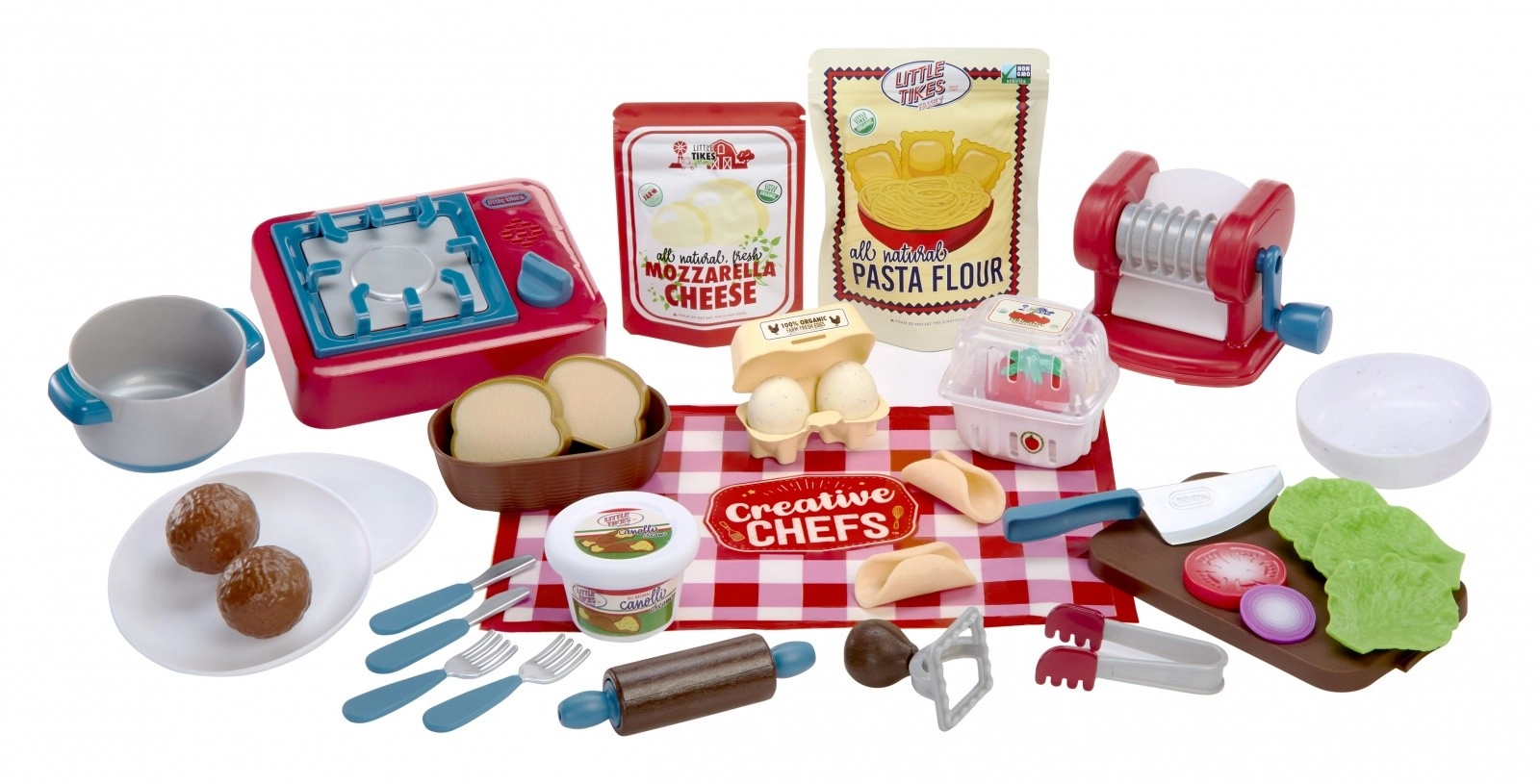 En funktionel pastaekstruder og tilbehør lader børn presse forskellige former for “nudler” og ravioli, rulle “dej” ud og tilberede en autentisk italiensk middag.