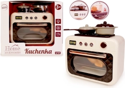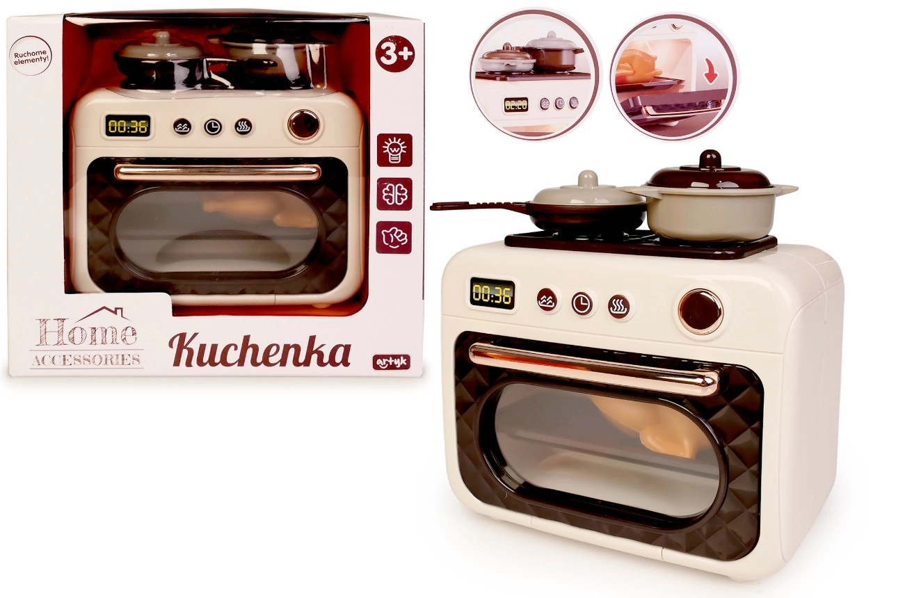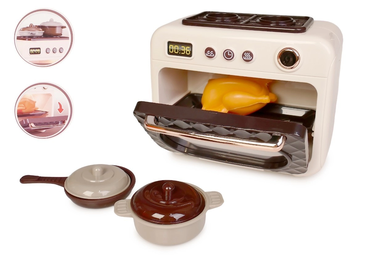 Opdag en realistisk børneovn, der vil glæde enhver lille kok. Når du trykker på knappen, lyser ovnen op, og en glad melodi spiller, hvilket gør legen endnu mere engagerende og underholdende.