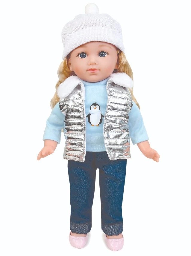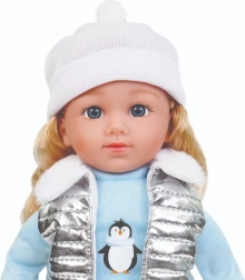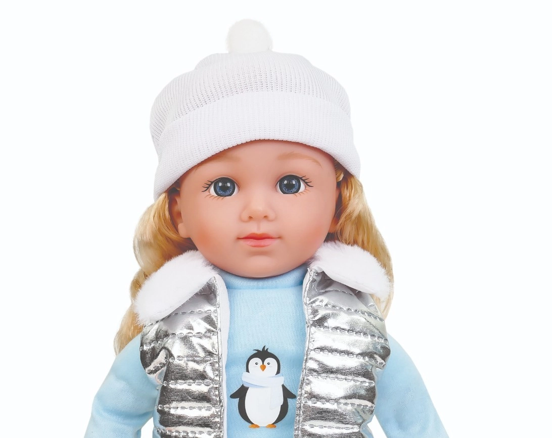 Dukken Natalia med blød hvid hue, sølvfarvet quiltet vest med pelskrave, lyseblå T-shirt med pingvinmotiv, mørke bukser og lyserøde sko er en fantastisk ven til daglig leg. Når man trykker på maven, siger hun polske fraser og synger 2 melodier, hvilket understøtter rolleleg og udvikler barnets fantasi.
