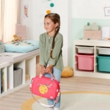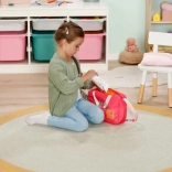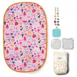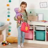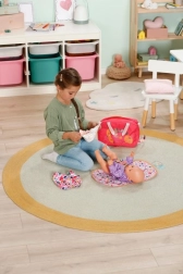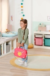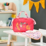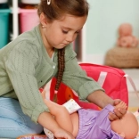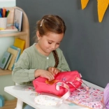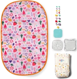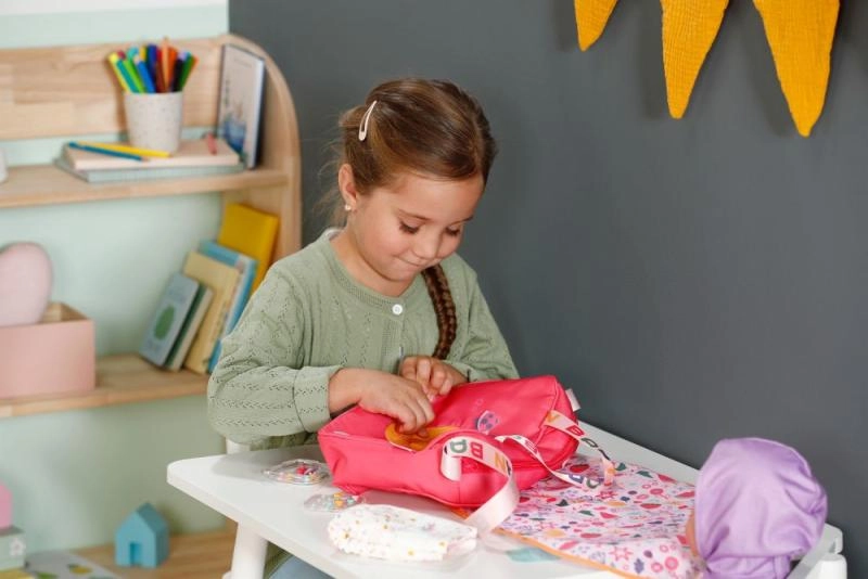 Med de klikbare pyntedele kan børn tilpasse tasken efter humør – det styrker kreativitet, finmotorik og omsorg for andre. Sættet indeholder et sammenklappeligt pusleunderlag til behagelig pusling overalt, en ble samt små tilbehør som pudderdåse og en boks til nødvendigheder.