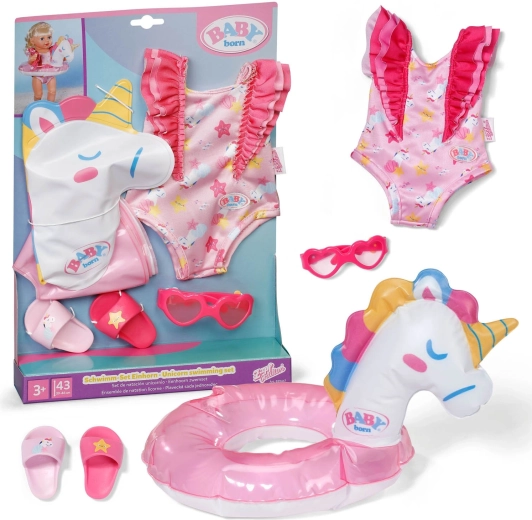 Det søde svømmesæt til BABY born-dukker i størrelsen 43 cm bringer sommerleg i vandet og i badekarret. Indeholder pink badedragt med enhjørningemotiv, oppustelig ring formet som en enhjørning, hjerteformede briller og pink sandaler. Takket være nem påklædning træner børn deres finmotorik og nyder en kreativ leg fuld af sommeroplevelser. Fremstillet af kvalitets- og holdbare materialer for sikker leg.