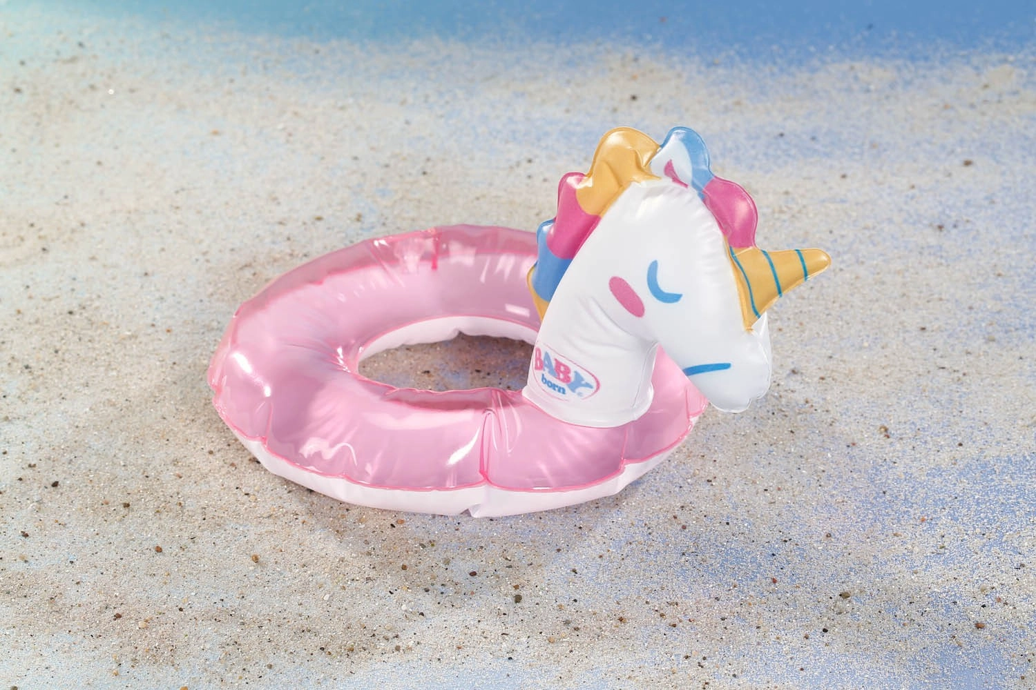 Med dette magiske sæt bliver BABY born-dukke stjernen ved enhver badetid. Den pink badedragt med flæser og enhjørningemotiv giver dukken charme, mens den oppustelige ring formet som en enhjørning sikrer sjov “svømning” i vandet. Stilen fuldendes af pink sandaler med stjerner og solbriller formet som hjerter.