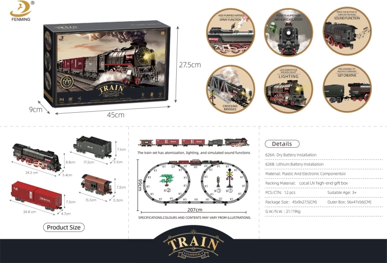 Tag på en nostalgisk tur med et retro tog, der giver en oplevelse som på en rigtig jernbane. Lokomotivet udsender røg fra skorstenen og sideåbninger under kørsel (tilføj blot vand med den medfølgende pipette), forlygten lyser, og autentiske lyde afspilles. Skinnerne er solide, sikre og meget lette at samle.