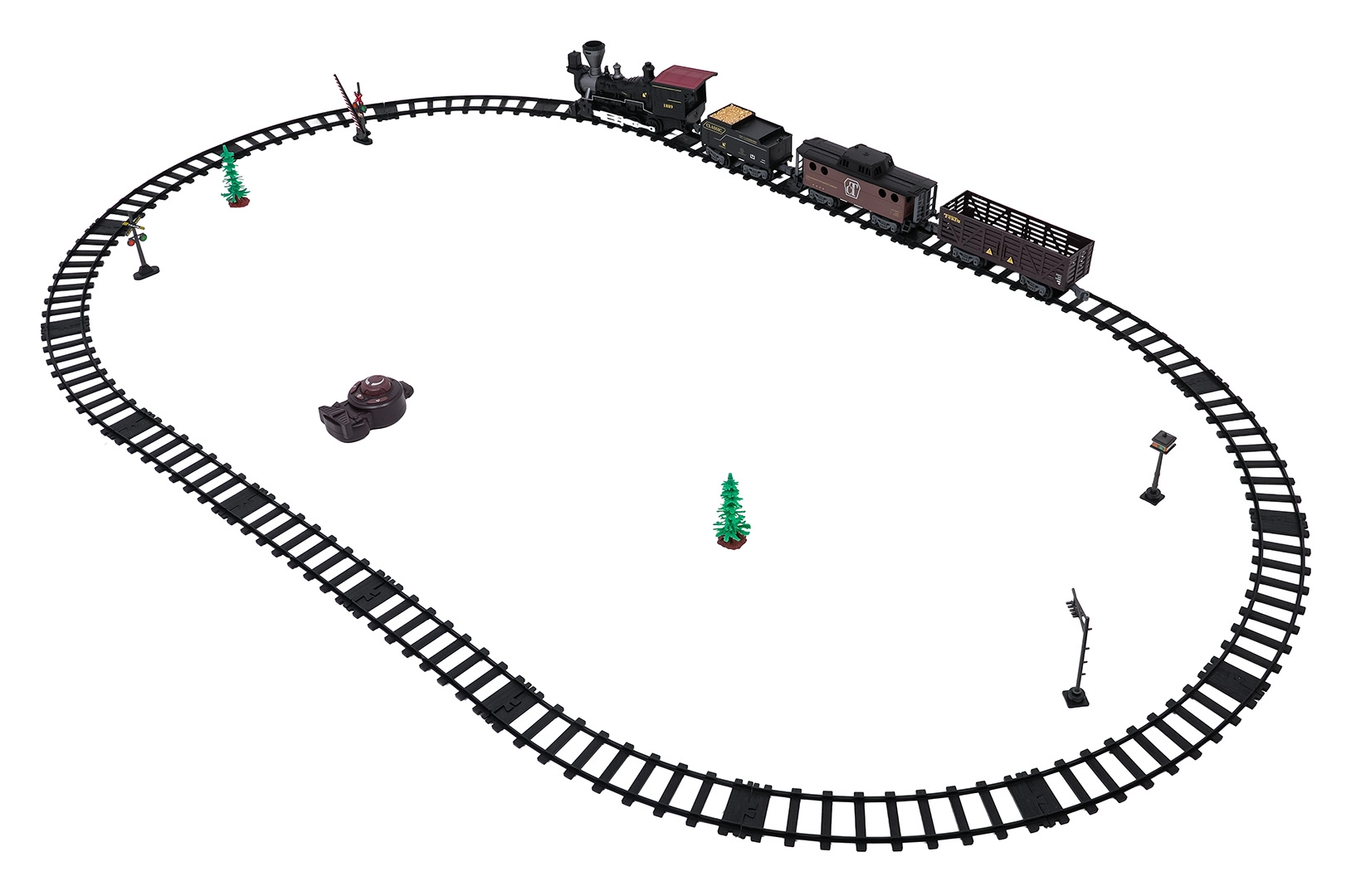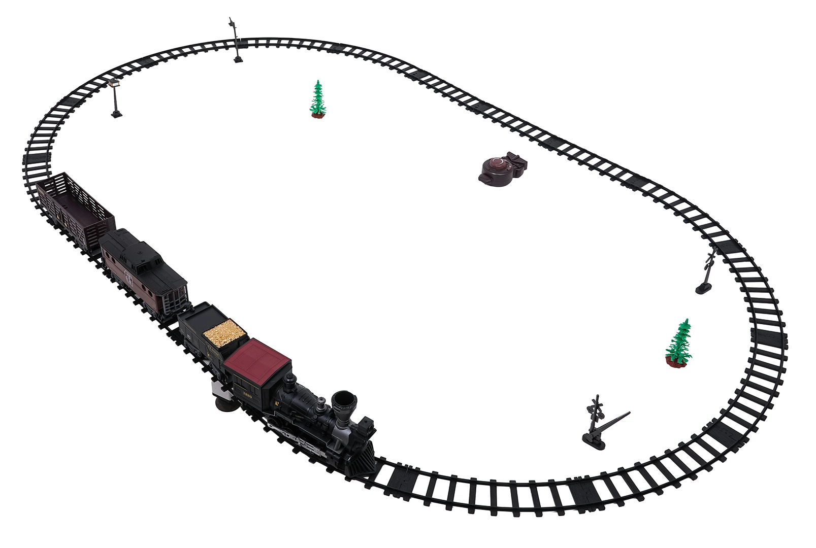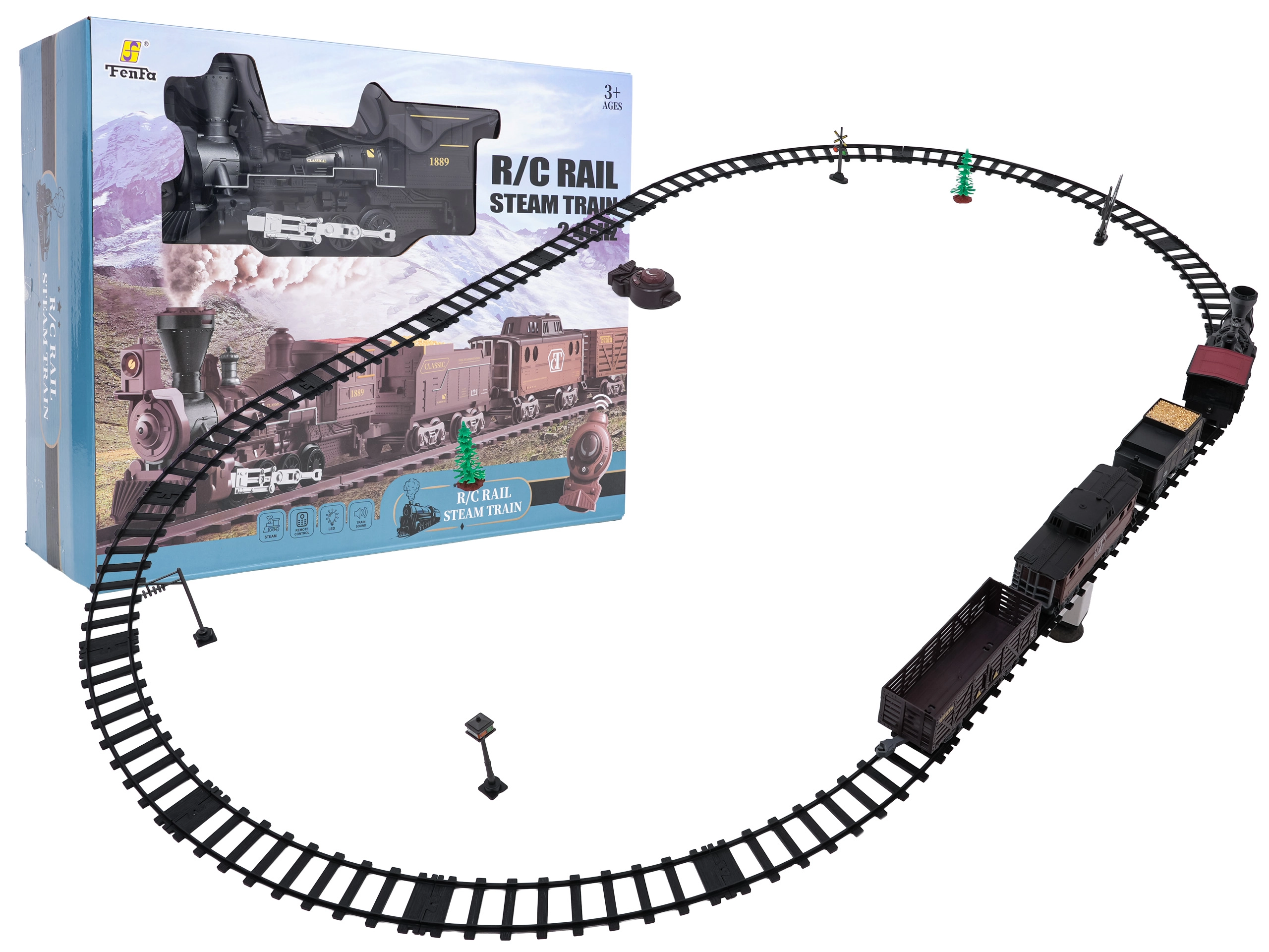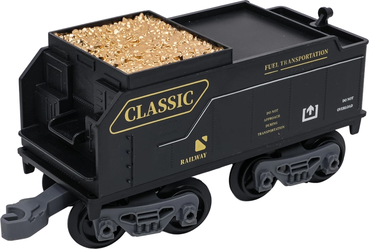 Fjernbetjeningen på 2,4 GHz sikrer en stabil forbindelse uden forstyrrelser. Du skifter nemt kørselsretning (frem/tilbage), stopper toget eller aktiverer dampen med ét tryk. Sættet indeholder lokomotiv, personvogn, tender med kul og tilbehør til nem opstart.