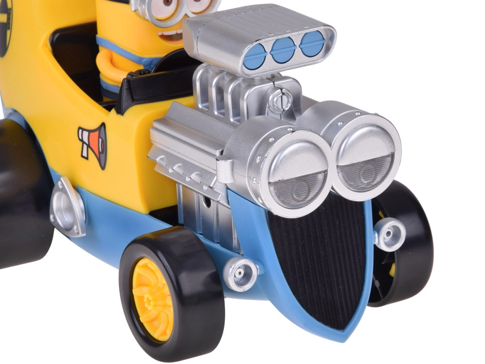 Sæt gang i festen med en banan-hot-rod med MINION bag rattet! Denne bil kombinerer farverigt, opfindsomt design med effekter, som børn elsker: ved tryk på knapperne høres sjove minion-replikker, fanfarer og horn, lysene tændes, og motoren vibrerer for en endnu mere realistisk oplevelse.