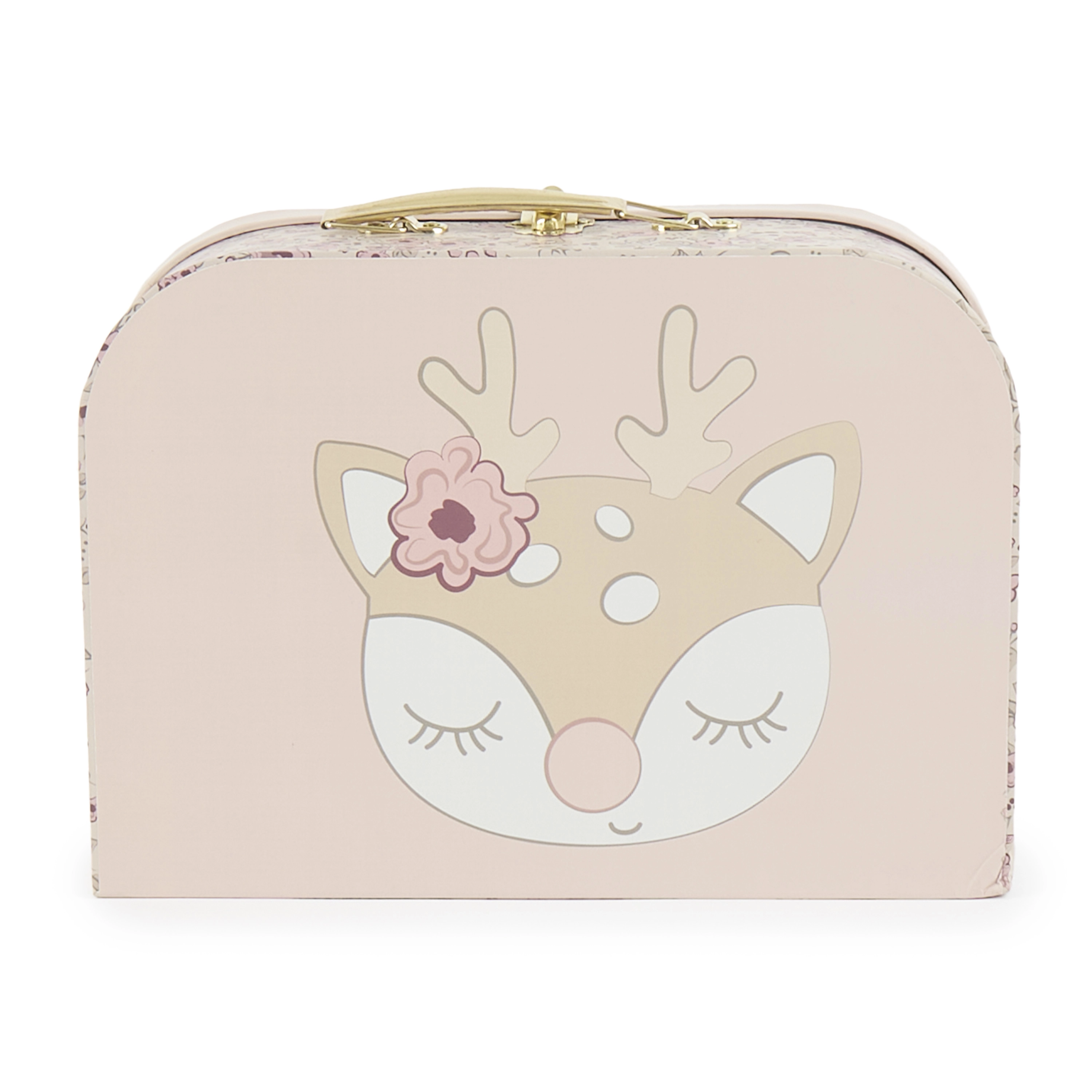 Sæt med tre dekorative kufferter i blide pasteller med motiv af rådyrkalven Ella gør opbevaring af legetøj og skatte til en leg. Børn vil elske det smukke design, og forældre vil sætte pris på den praktiske udførelse med kvalitetsbeslag og behageligt håndtag.