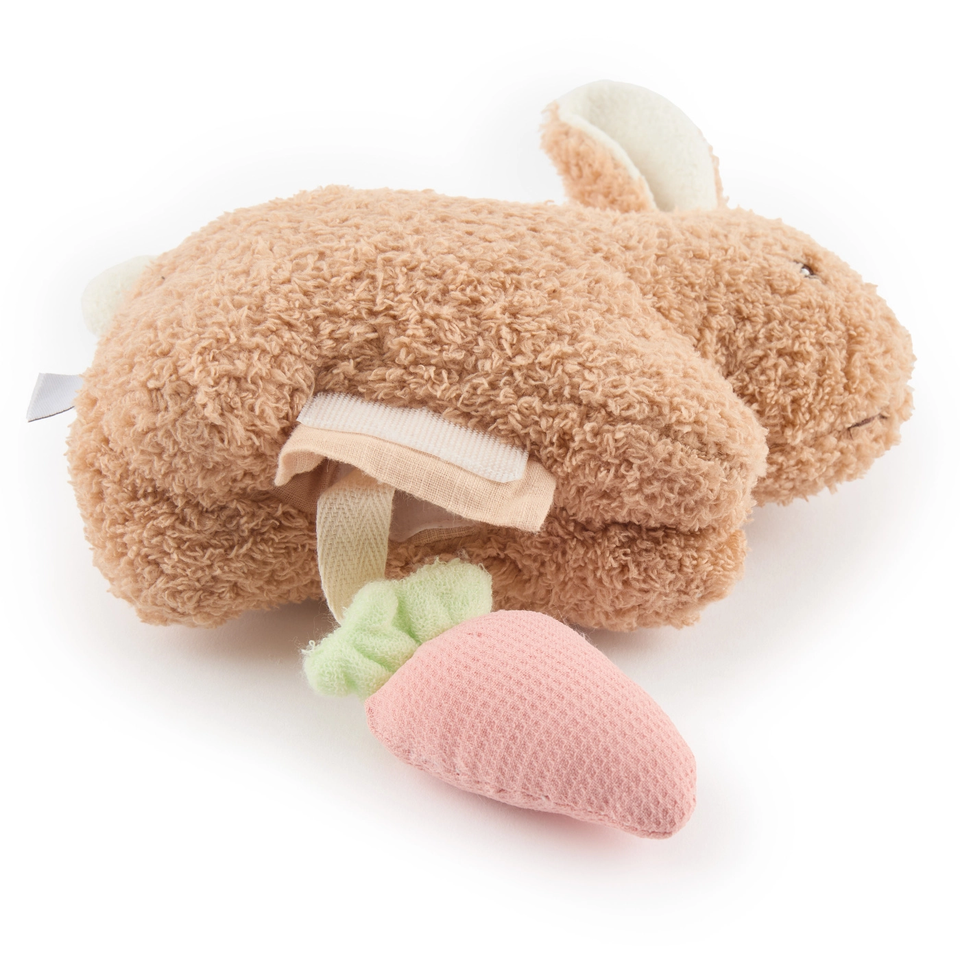 Den udtagelige gulerod i kaninens mave knitrer blidt ved tryk og motiverer babyen til at udforske, gribe og opdage igen og igen.