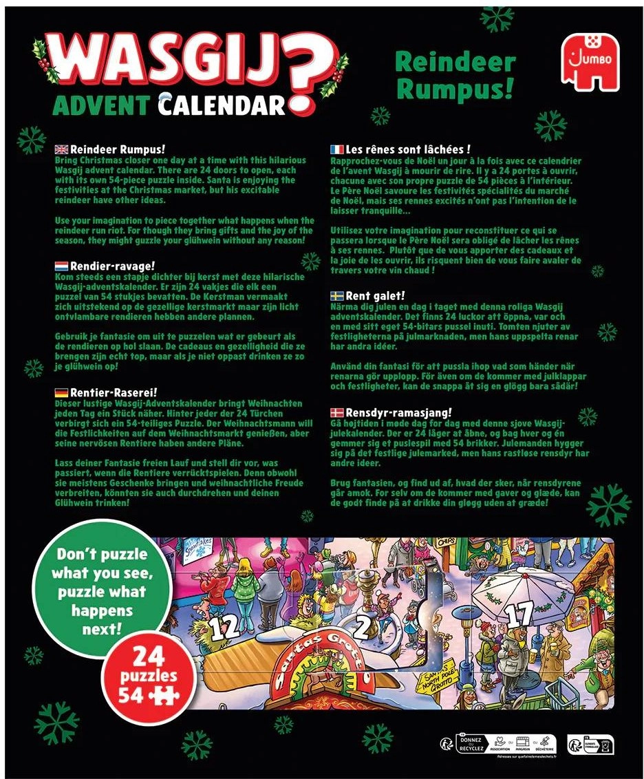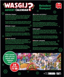 Gør ventetiden til juleaften endnu sjovere med WASGIJ adventskalenderen: Løsslupne rensdyr! Denne kalender byder på et unikt koncept, hvor det færdige billede ikke er det samme som på æsken. Du leder efter spor, bruger fantasien og lægger scenen fra en anden vinkel. Den ideelle gave til puslespilselskere og erfarne puzzlere, der vil prøve noget nyt.