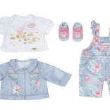 Sættet indeholder hvid T-shirt med gyldent motiv, lyseblå denimjakke, blå denimseleshorts med blomsterprint og bløde sokker/hjemmesko. Alt passer perfekt til dukker på 43 cm.