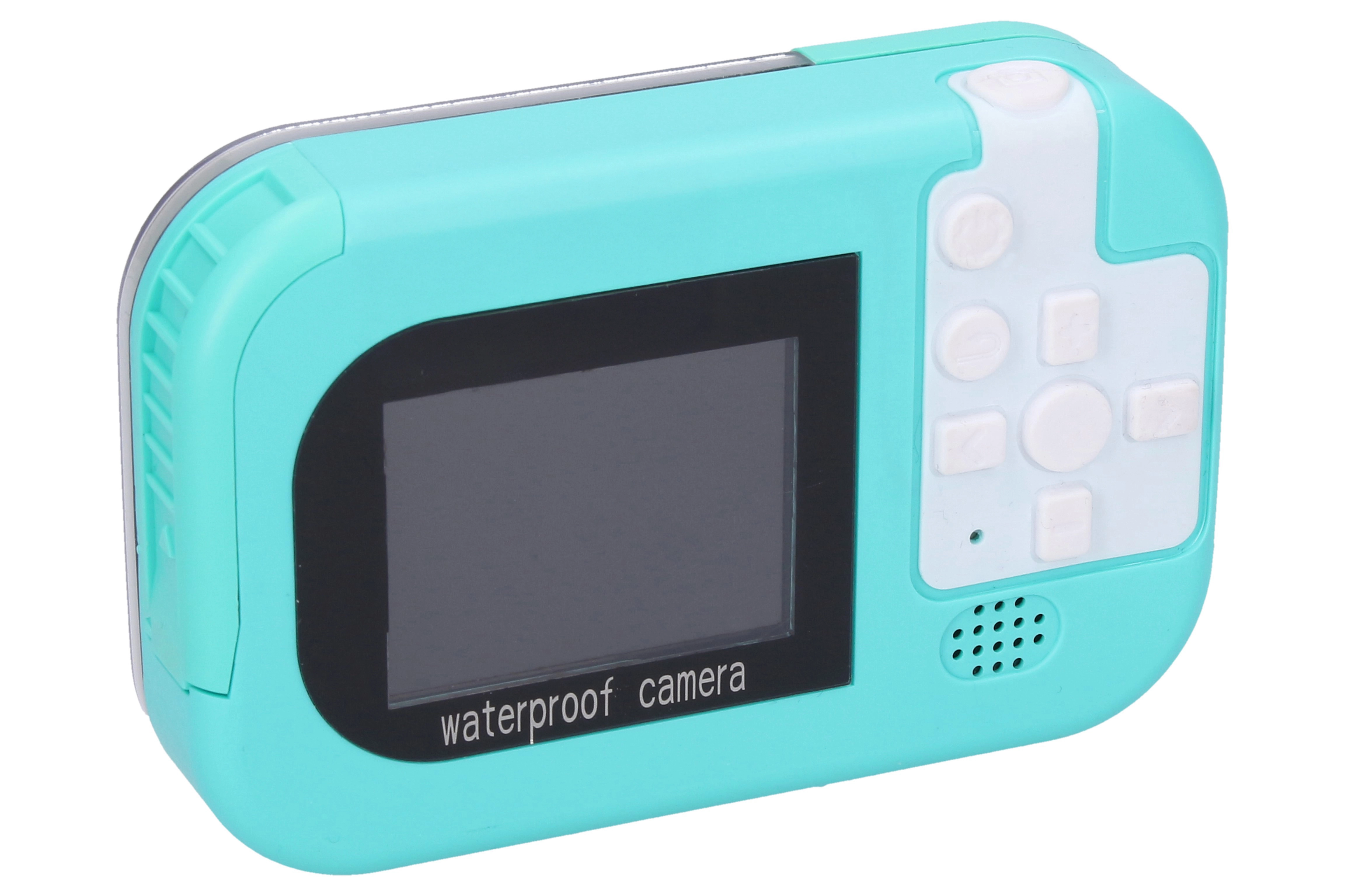 Robust hus med gummierede elementer beskytter kameraet mod sprøjtende vand og stød. Børn kan trygt fotografere ved poolen, på stranden og i regnvejr.