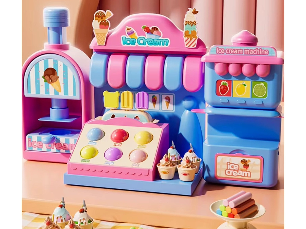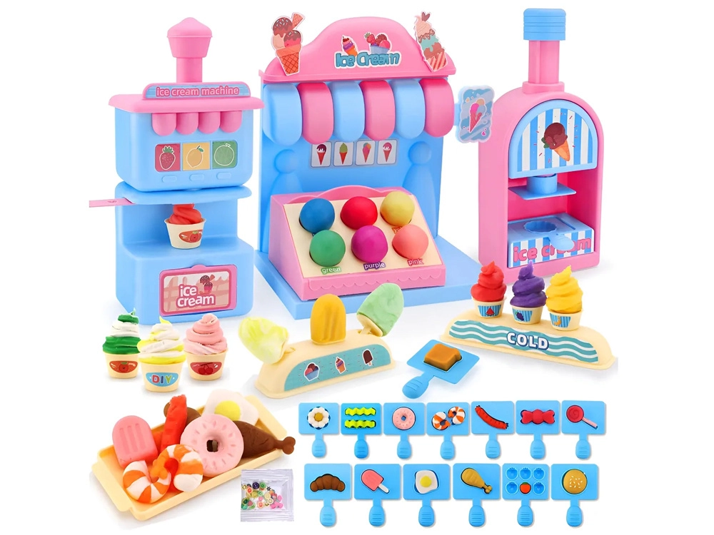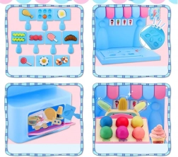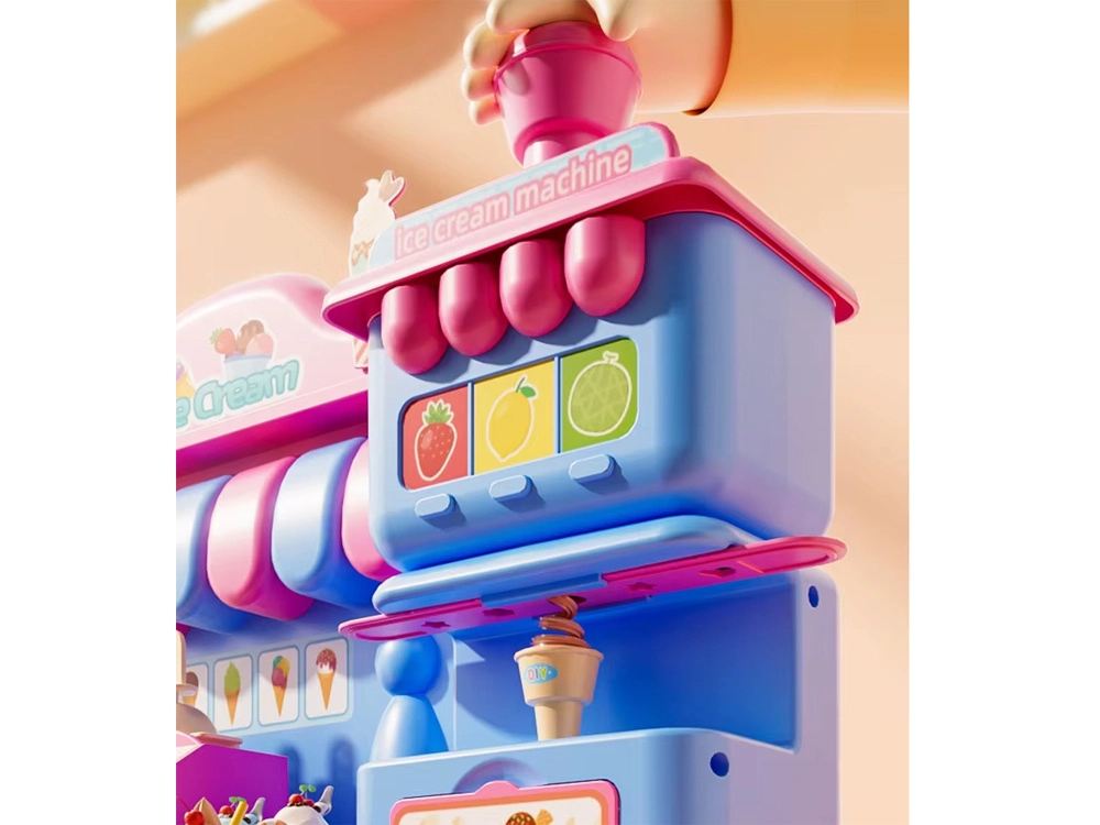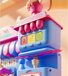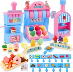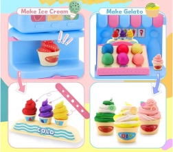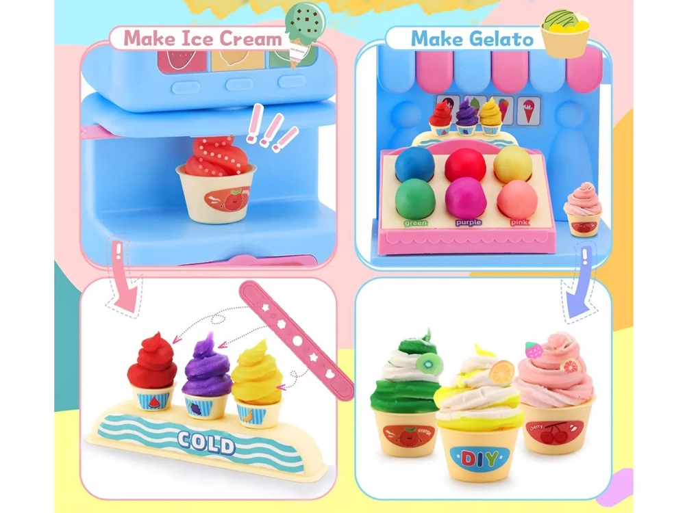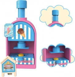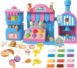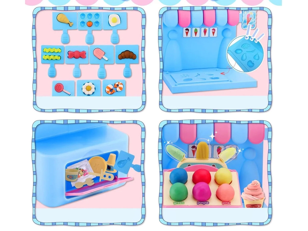 Det komplette legesæt omfatter en ismaskine til at presse farverige portioner, en salgsdisk til fremvisning af lækkerier og en presse med “bageform” til at forme småkager og kager. Alt er holdt i blide rosa og blå nuancer, så kreationerne ligner noget fra en ægte konditormontre.