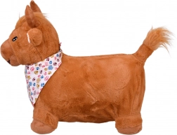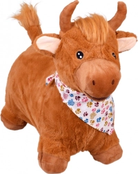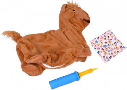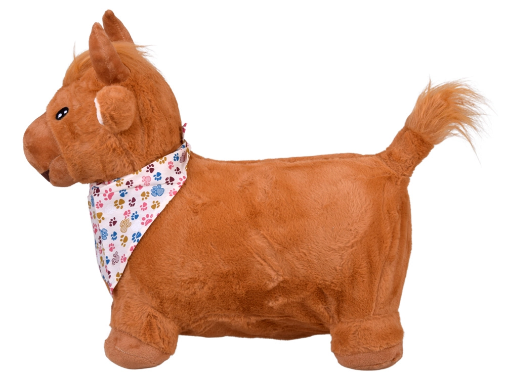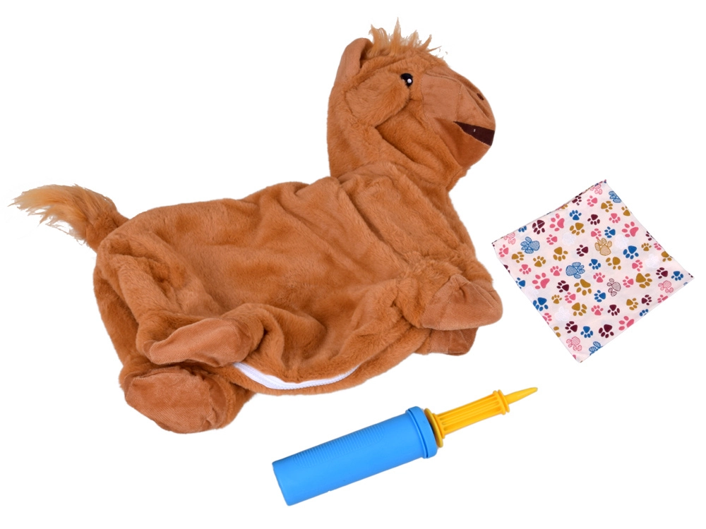 Hoppetyren er dejligt blød at røre ved, med sikkert broderede øjne, små horn og en busket hale. Åbn blot lynlåsen på maven, indsæt og pust op med den medfølgende pumpe – på ingen tid er den klar til eventyr. Tørklædet med det legesyge poteprint giver et originalt look, som børn elsker.
