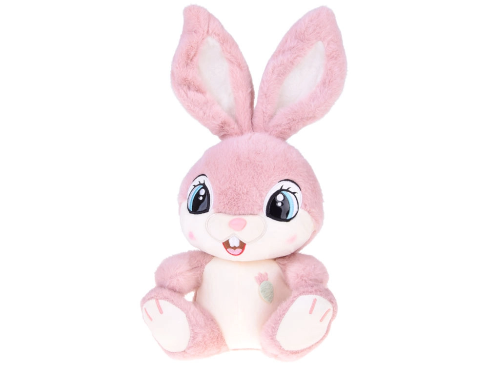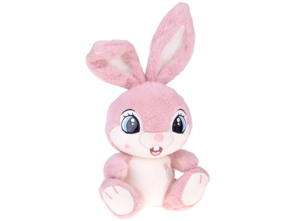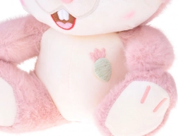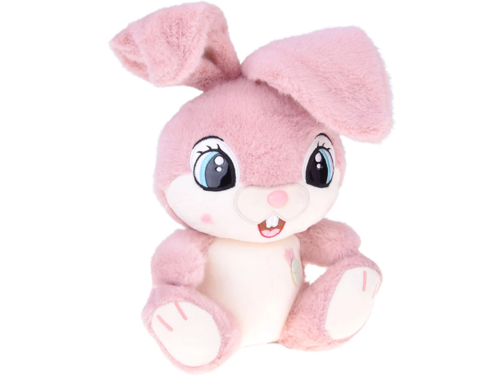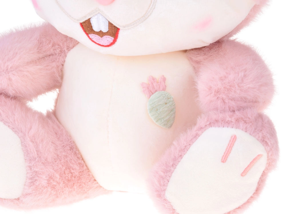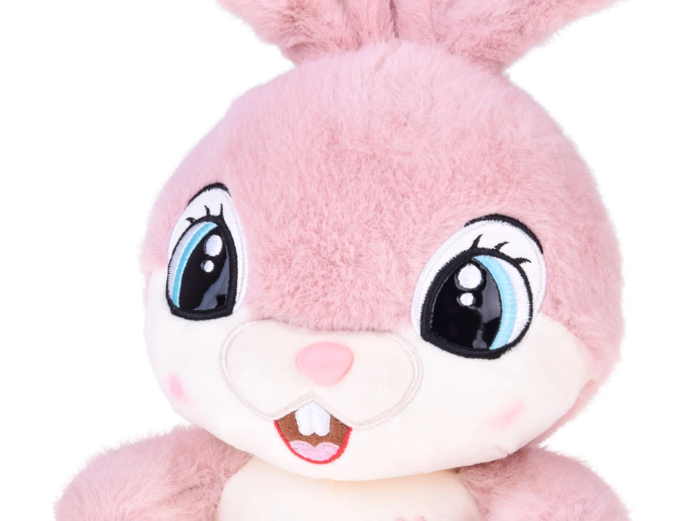 Fløjlsblød plys i en pudderlyserød tone med kontrasterende cremefarvet mave indbyder til kram og giver en beroligende følelse.