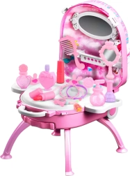 Med følger armbånd, perlekæde, ringe, kam, hjerteformet spejl samt imitation af læbestifter, neglelak og “parfumer” – alt i børnesikker plast til fantasifulde udklædninger og rolleleg. Hele sættet er let, holdbart og nemt at transportere takket være det udtrækkelige håndtag og hjulene.