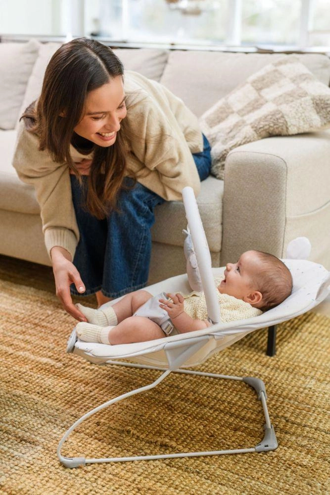 Den aftagelige bøjle med to legetøj fremmer barnets visuelle og motoriske færdigheder. Betrækket kan nemt tages af og vaskes i maskine, så liggestolen holdes ren uden besvær. Skridsikre fodender og en solid ramme giver stabilitet på forskellige overflader.