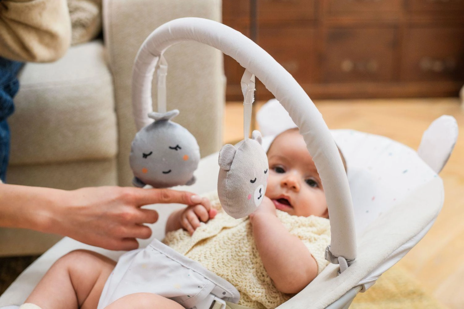 Den aftagelige bøjle med to bløde legetøj understøtter visuel sporing, hånd–øje-koordination og de første greb.