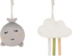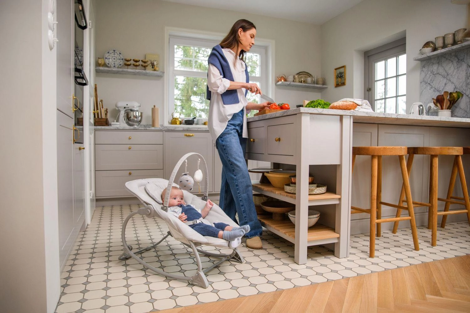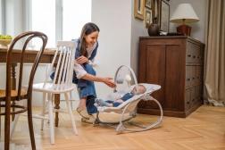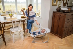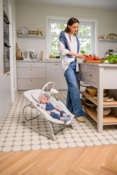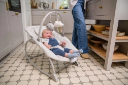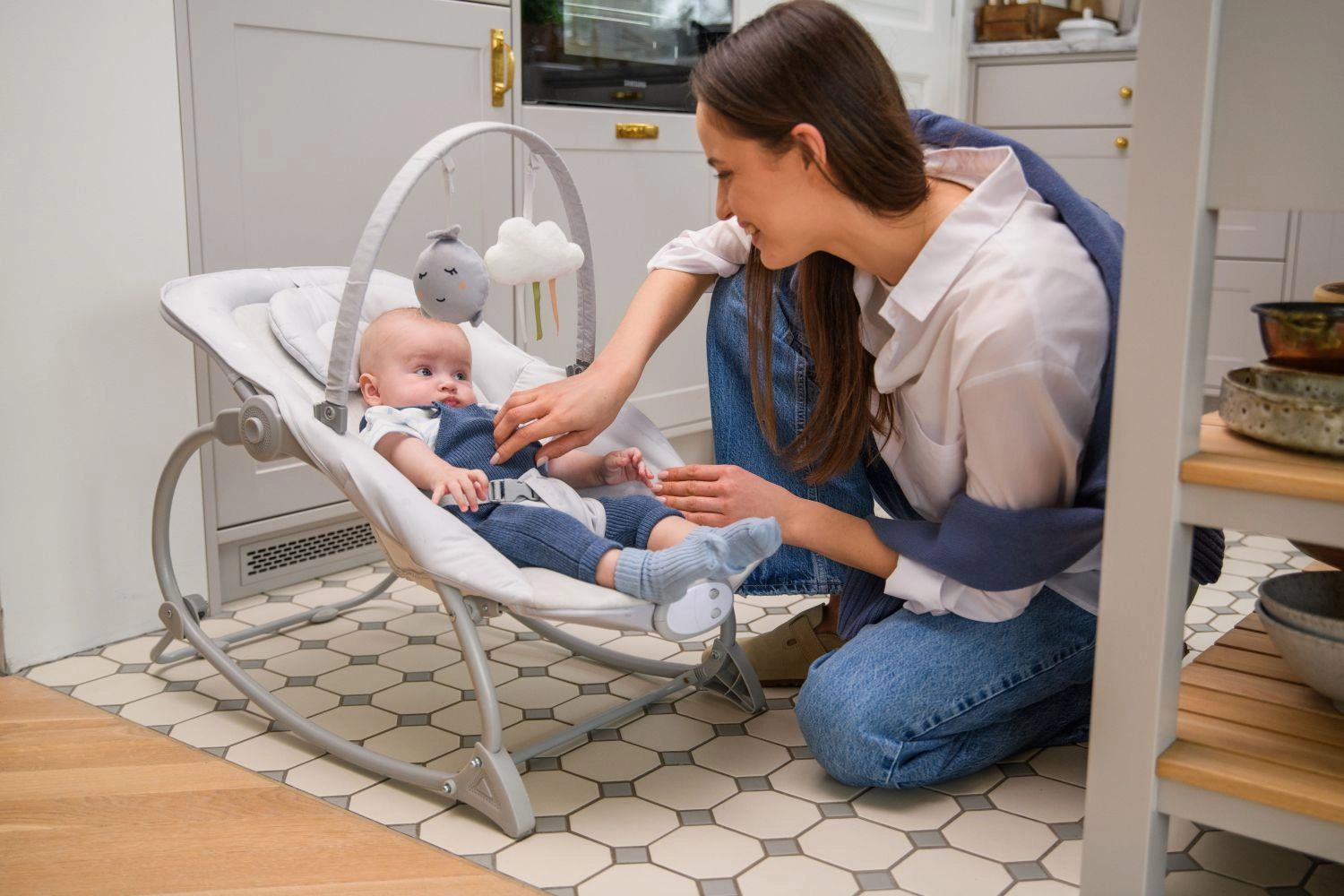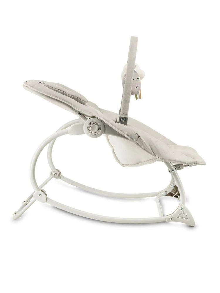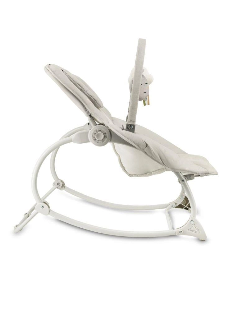 Den stabile konstruktion, 3-punktssele og mulighed for at låse vuggefunktionen øger sikkerheden. Legetøjsbøjlen med to bløde legetøj stimulerer sanserne og underholder babyen.
