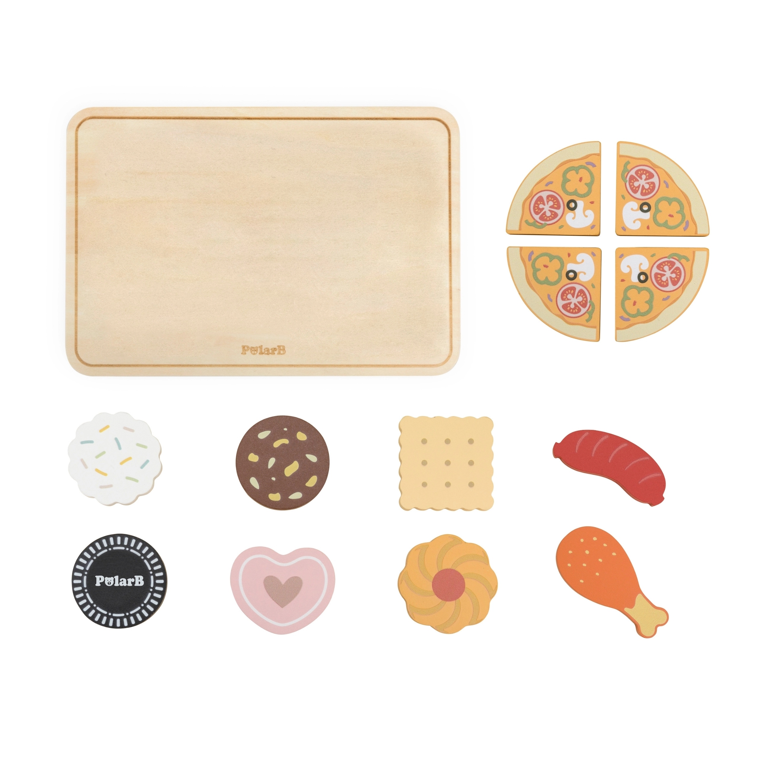 - Rigt tilbehør: 12 træmadvarer inkl. kager, pizza (4 stykker), pølse og kyllingelår.