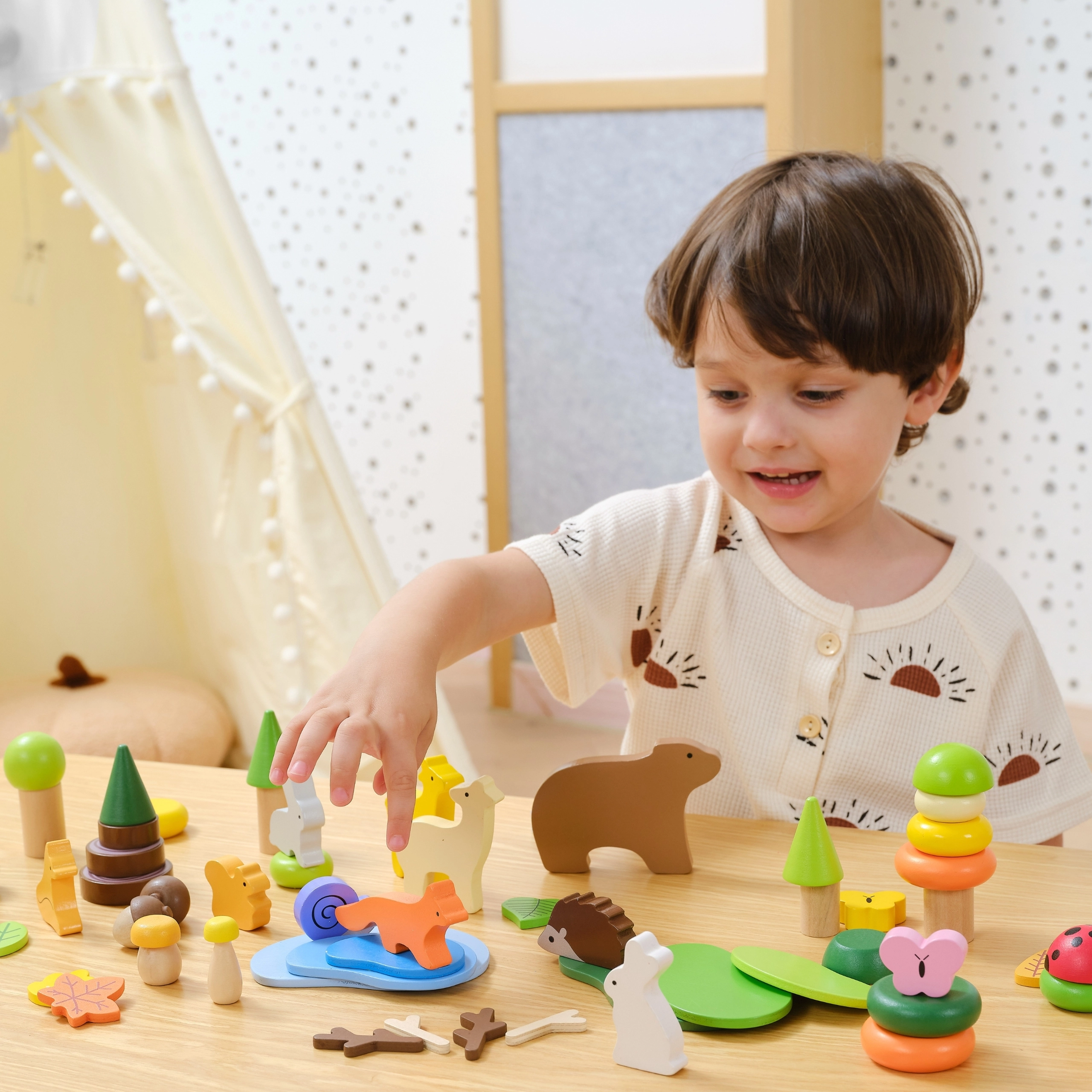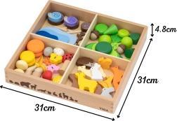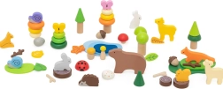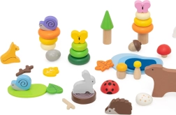 Farverige figurer af dyr og natur-elementer lader børn skabe scener, stable og balancere. Ideelt til fri leg og historiefortælling.
