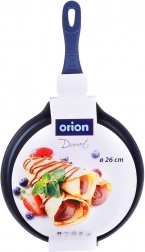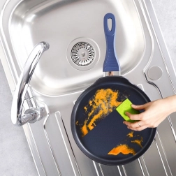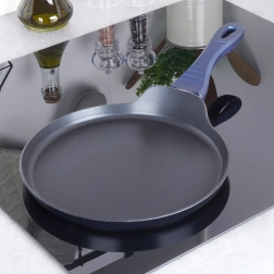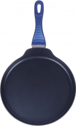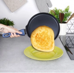 Håndtaget med blød silikone forbliver køligt og er behageligt at holde om. Den lave kant gør det nemt at hælde dej op, løfte og vende pandekager. Pandens belægning er fri for PFOA og PTFE, modstandsdygtig over for rengøringsmidler og takket være induktionsbunden kompatibel med alle typer kogeplader.