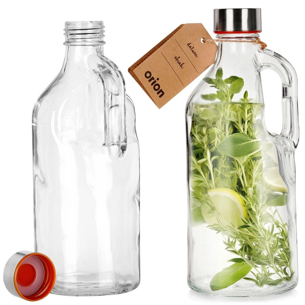 Denne glasflaske med hank er et perfekt valg til vand, juice, lemonader, smoothies og hjemmelavede sirupper eller likører. Det transparente glas giver overblik over indholdet, og metallåget med siliconepakning forhindrer pålideligt lækage og holder drikke friske længere. Takket være hanken ligger flasken godt i hånden og gør det nemt at hælde.