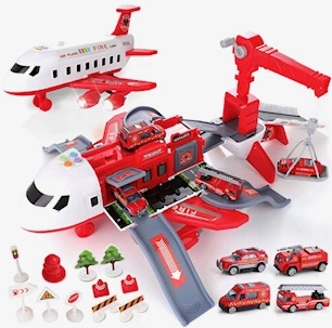Dette originale sæt kombinerer et fly og et brandmandsanlæg i ét. Når det foldes ud, bliver flyet til et omfattende parkeringsområde med fungerende kran, hvor børn kan lege indsatsaktioner og redningsscenarier. De kompakte mål, når det er klappet sammen, gør det nemt at bære og opbevare.