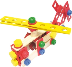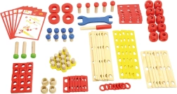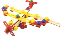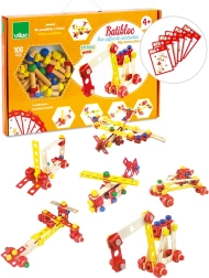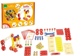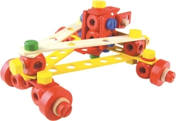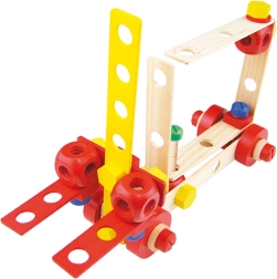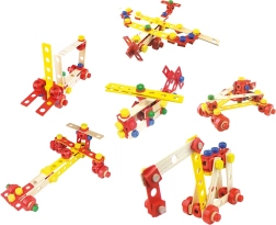 Farvede og naturlige lameller, skruer, møtrikker, hjul og forbindelser lader børn samle køretøjer og fantasifulde konstruktioner og bygge dem om igen og igen.