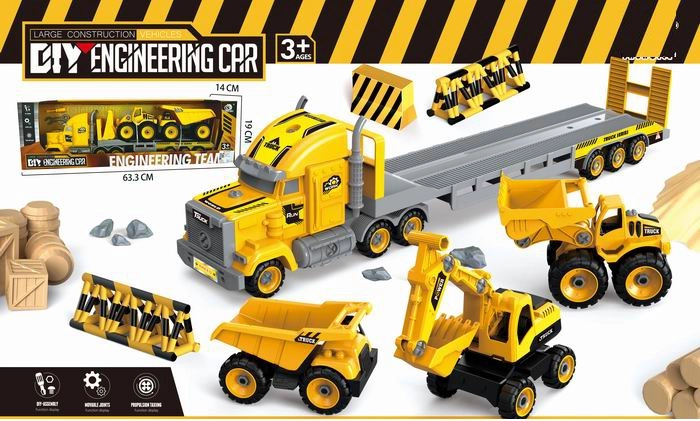 Dette detaljerede sæt tilbyder alt til actionfyldte byggeeventyr. Børn kan laste maskinerne på transportørens platform, køre dem til byggepladsen og reparere dem med de medfølgende værktøjer. Kvalitetsudførelse og attraktive farver sikrer mange timers leg.