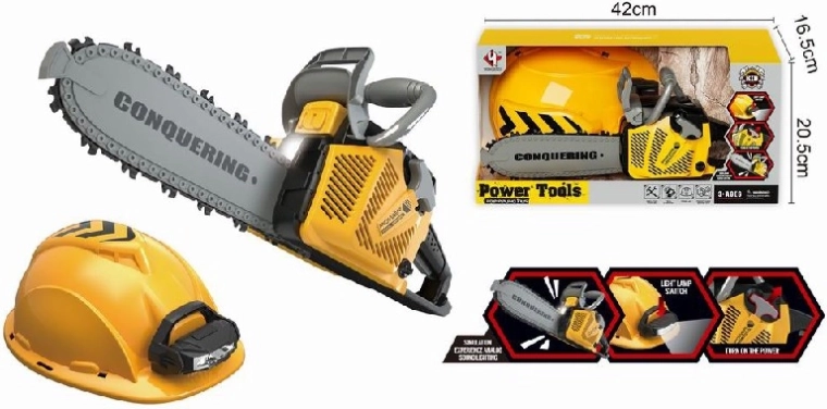 Sjovt sæt til små skovhuggere indeholder en realistisk legetøjs-kædesav med lys- og lydeffekter, en børnehjelm og en lommelygte. Sikker og ikke‑giftig plast, naturtro udseende og nem betjening vil glæde enhver lille gør‑det‑selv’er.
