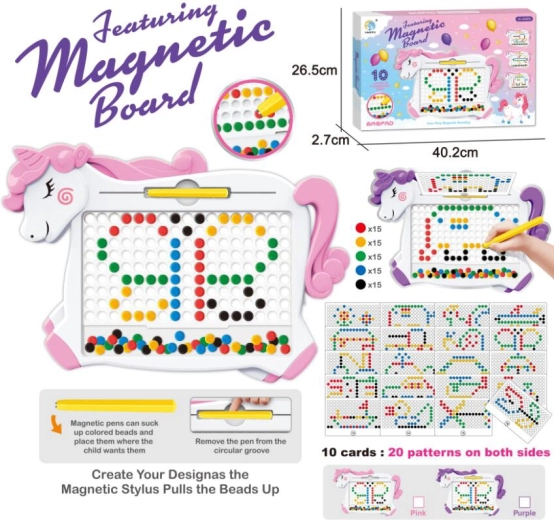 Denne søde magnettavle med enhjørningemotiv er et fantastisk redskab til de første tegninger og træning af finmotorik. Børn kan med magnetpennen skabe former, billeder og mønstre og til enhver tid nemt slette og starte forfra. Takket være skabelonerne er tegning endnu sjovere og mere intuitiv.