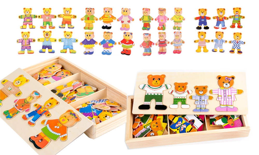Træpuslespillet “klæd bjørnene på” giver timevis af kreativ leg. Børn kan skifte udtryk og tøj på de enkelte medlemmer af bjørnefamilien og dermed øve farver, mønstre og logisk matchning. Legen understøtter effektivt koordinationskompetencer, fantasiudvikling og selvstændighed.