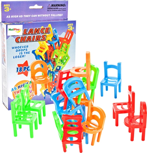 Et sjovt familiespil med 18 små stole i 3 farver, hvor vinderen er den, der først slipper af med alle sine brikker. Enkle regler, hurtige runder og spændende byggeri og stabling garanterer masser af latter. Ideelt til rejser takket være kompakte pakningsmål og let greb for børn.