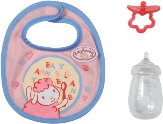 Nyd at fodre din Baby Annabell dukke med dette søde sæt. Det indeholder en gennemsigtig flaske, en lyserød hagesmæk med et får, og en beroligende rød sut, der understøtter legen og plejen af dukken.