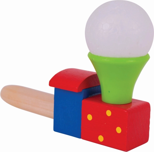 Pust i lokomotivets skorsten og se den hvide kugle svæve elegant. Børn træner naturligt både vejrtrækning og koordination.