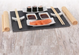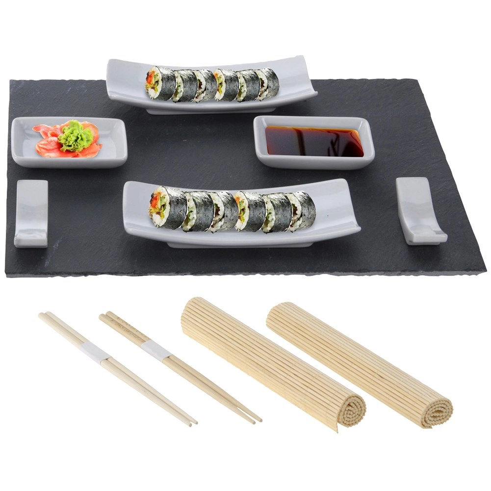 Skåle til saucer, små tallerkener og hvilere til spisepinde muliggør ren og æstetisk servering, mens stenpladen fremhæver udseendet af dine sushiruller.